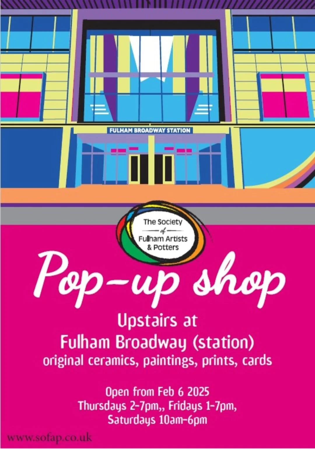 The Society of Fulham Artists and Potters (SoFAP), a pillar of the local art community since 1952, are opening their first-ever pop-up gallery and shop on the first floor of the Fulham Broadway shopping centre this month. The pop up starts on 6 February and will showcase a diverse collection of original artworks all by artists based in SW6 including ceramics, handcrafted items and artist designed items; all available for purchase. This pop-up gallery is an exciting new milestone for SoFAP, extending its rich tradition of biannual exhibitions in our urban village in a new venue. Visitors will have the opportunity to engage directly with our vibrant local art scene, discover unique pieces that reflect the talent and diversity of artists here in Fulham.