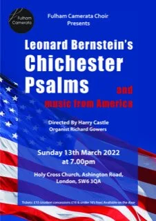 Fulham Camerata is inviting all music lovers to the Chichester Psalms and Music from America on Sunday 13 March at 7.00pm in Parsons Green at Holy Cross Church, Ashington Road, SW6 3QA.