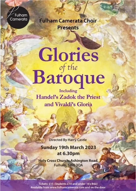 Fulham Camerata’s Spring concert is entitled ‘Glories of the Baroque’ and explores music from the well known trio of Bach, Handel and Vivaldi, as well as revisiting Monteverdi, a composer the choir is more than familiar with, having tackled his Vespers in November of last year.