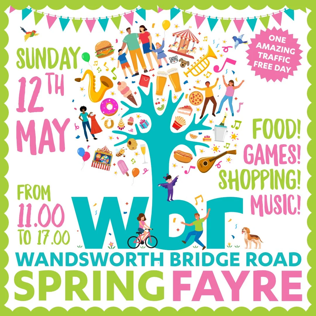 Now in its 3rd year Wandsworth Bridge Road will once again be fully pedestrianised for the WBRA’s Spring Fayre! Last year’s event attracted over 14,000 visitors who enjoyed a car-free Wandsworth Bridge Road for the day. This beautiful tree-lined road will be transformed for the day for people to enjoy local restaurants, cafes & shops trading on the street alongside 110+ visiting stallholders and food traders. There will be live music on two stages and 2 busking pods, traditional funfair games, Maypole dancing accompanied by a live fiddle player, a dedicated Children’s Activity Area with free events ranging from kids’ yoga to circus acrobatics, football, singing and dancing. Rock Climbing Wall, Penalty shoot-outs with Chelsea Football Club Foundation & yoga classes for all Cycle Zone: huge range of cargo-bikes & E-bikes to try, free bike repairs. Local Charities, community groups, Fulham Past: Fulham Future Exhibition and more! https://wbrassociation.org.uk/spring-fayre/