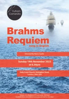 Join Fulham Camerata chamber choir at Holy Cross Church, Ashington Road, SW6 where directed by Harry Castle they will sing Brahams Requim in English. Brahms was deeply affected by his mother’s death and this major choral work was said to be written partly in her memory and laid the foundation of Brahms international reputation. It was composed between 1865-1868 and comprises 7 movements which together last 65-80 minutes.