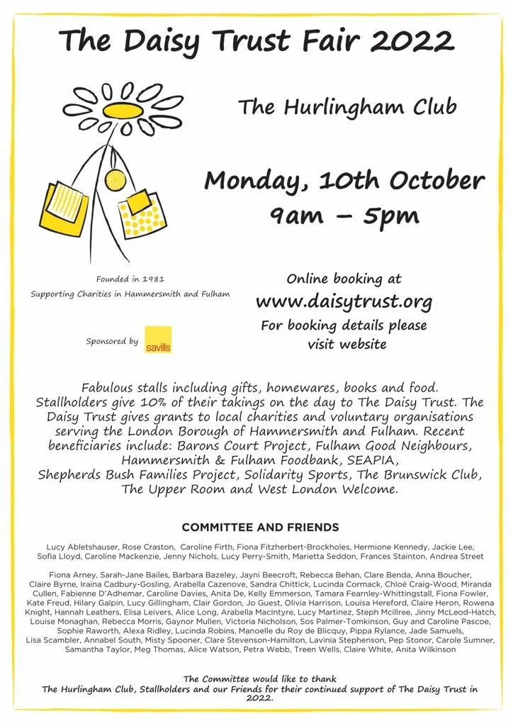 The Daisy Trust Fair takes place at The Hurlingham Club on Monday 10 October (9.00am- 5.00pm). There are over 100 stallholders, predominantly independent brands, taking part and showcasing great gifts for women, men and children. Making a purchase at this event has a real feel good factor as all stallholders kindly donate 10% of their sales to The Daisy Trust which in turn supports their beneficaries within Hammersmith and Fulham. Early bird tickets are now available on line at a cost of £8 (see link for tickets below).