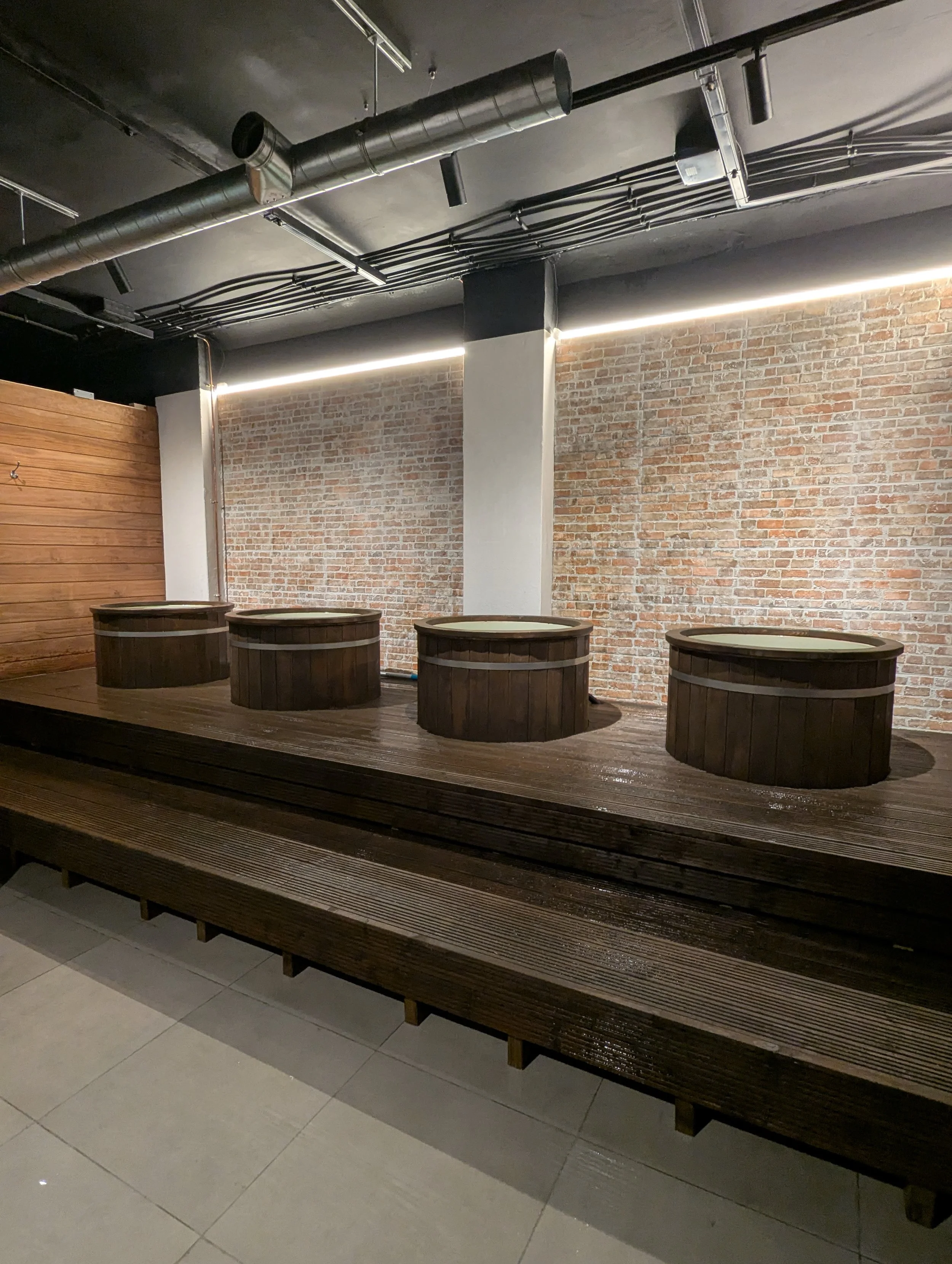 Pulse Club Sauna have opened their first flagship in Fulham with the am of making sauna and ice bath culture a regular and affordable routine. Urban Village LDN were invited down for a sneak peek before they officially opened this weekend. As soon as we stepped through their doors on the North End Road we were given a warm welcome before heading down to check out the main space where the community sauna and four ice plunge pools are located. The interiors are stunning think soft lighting, bare brick walls, wooden cylindrical plunge pools and waterfall showers all combining to make what feels like a relaxing social space.